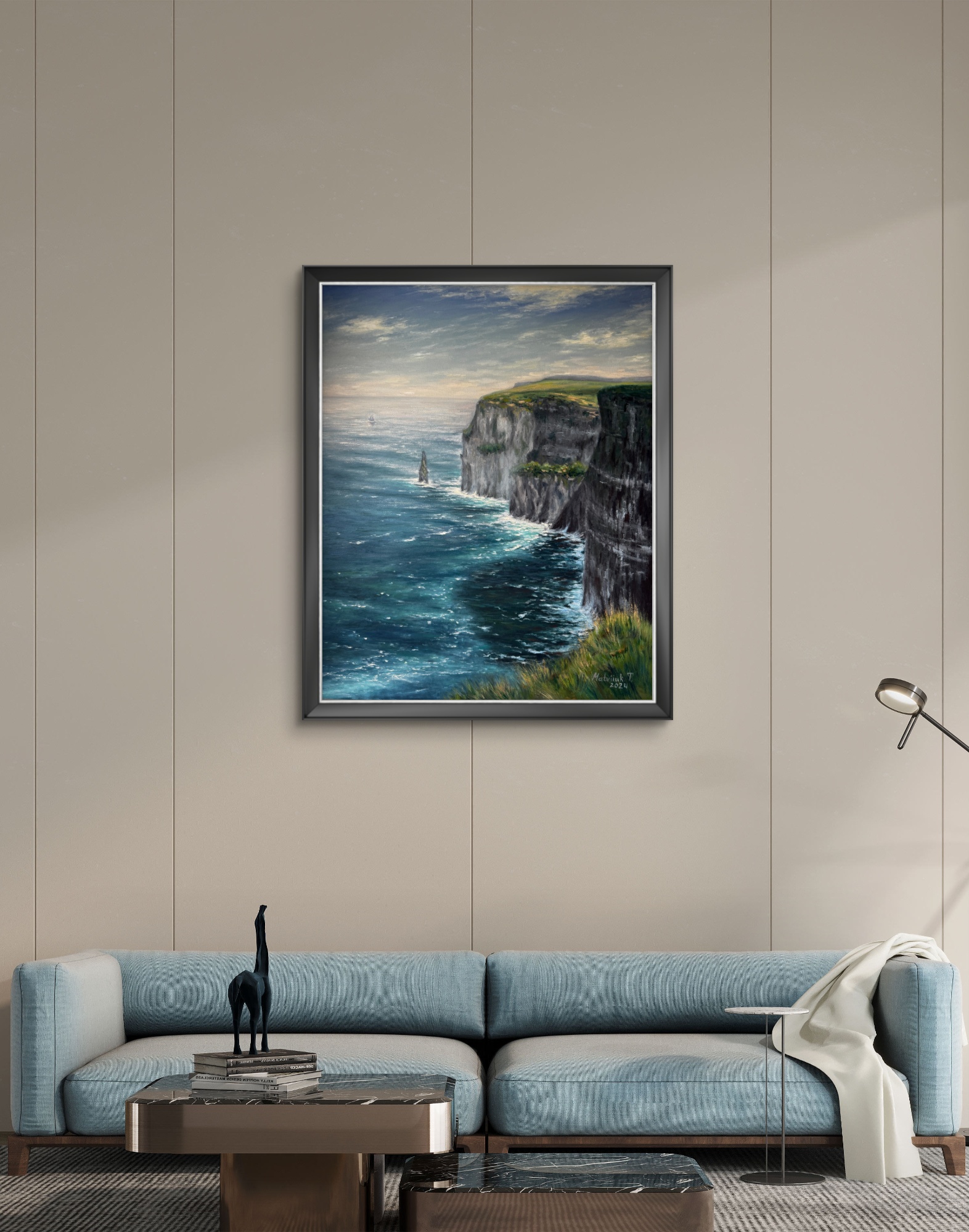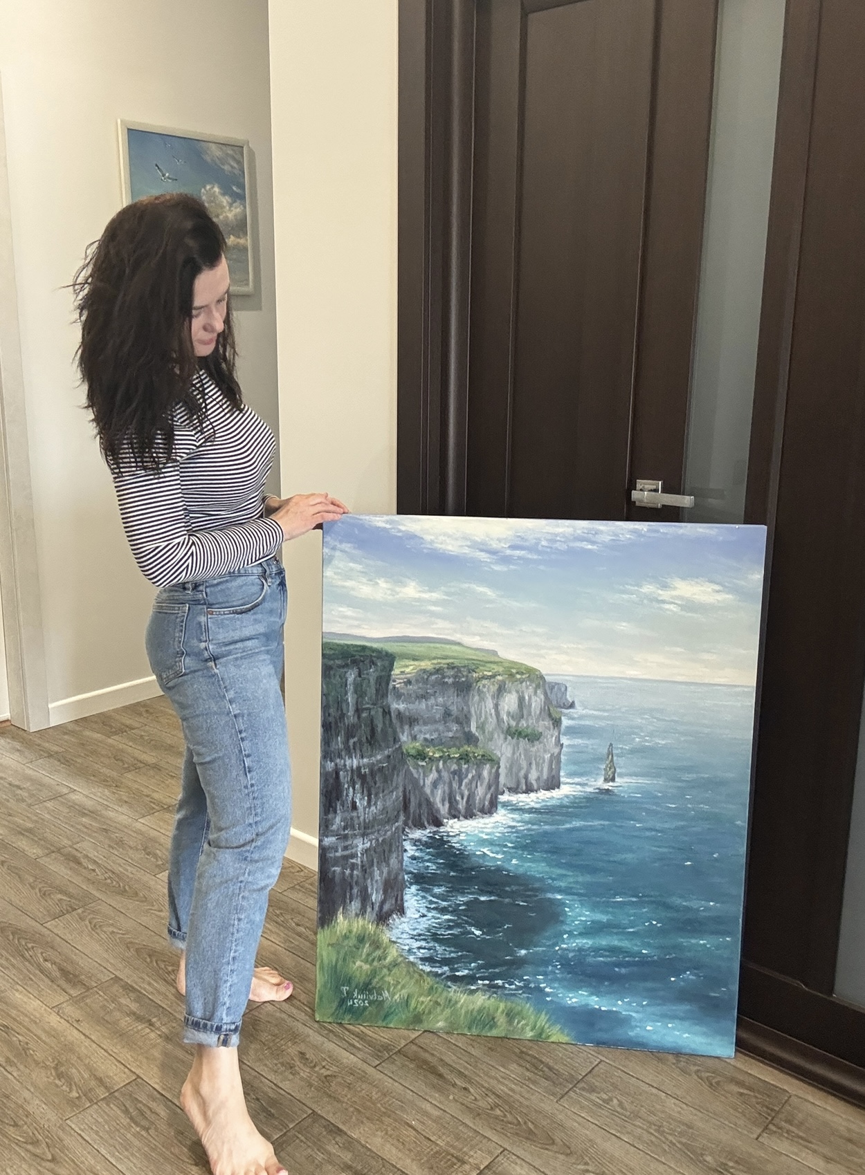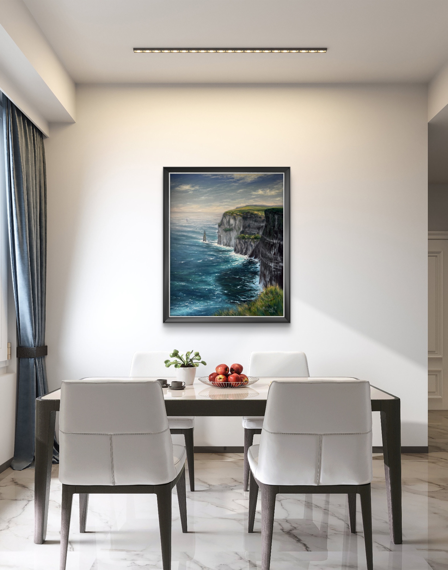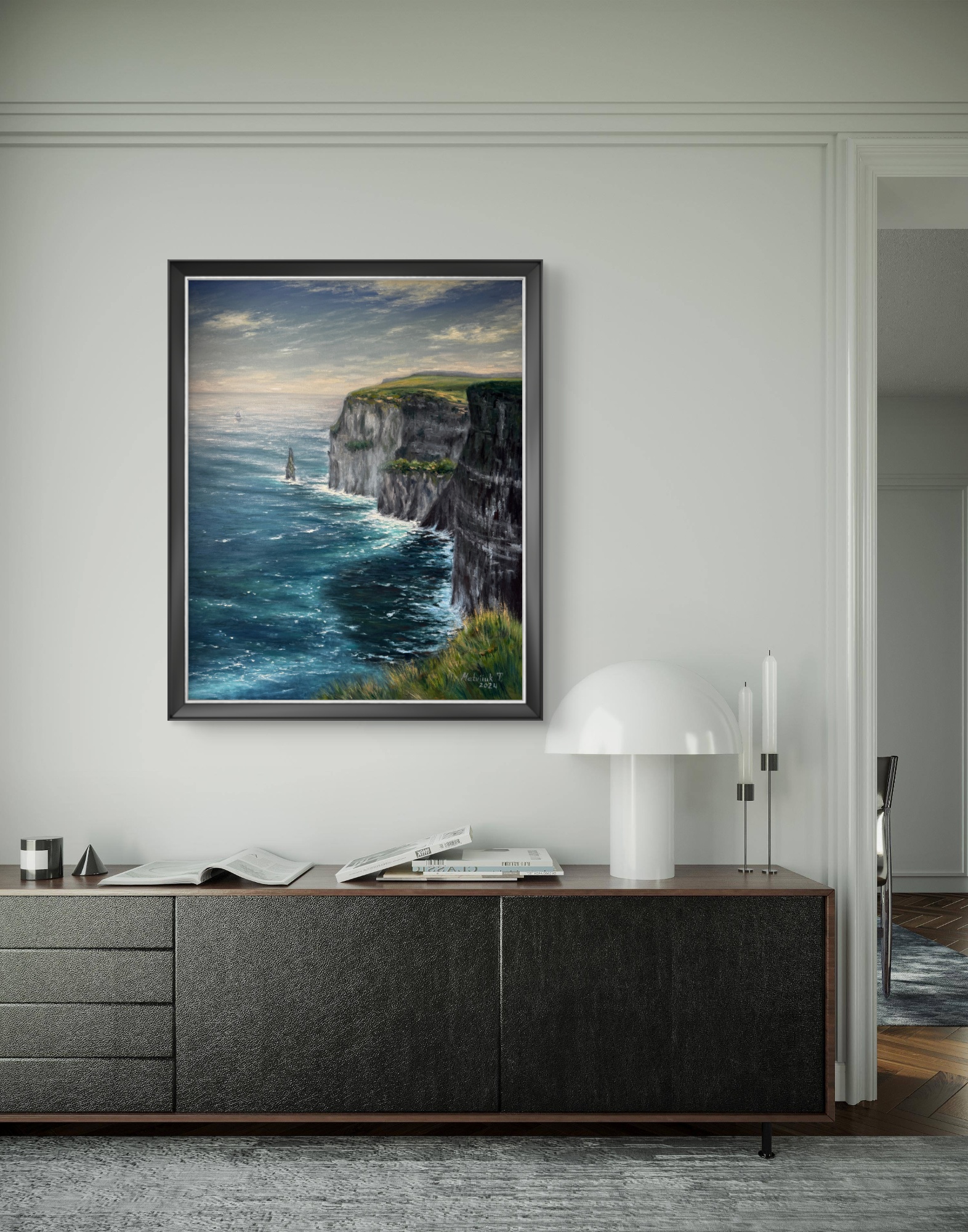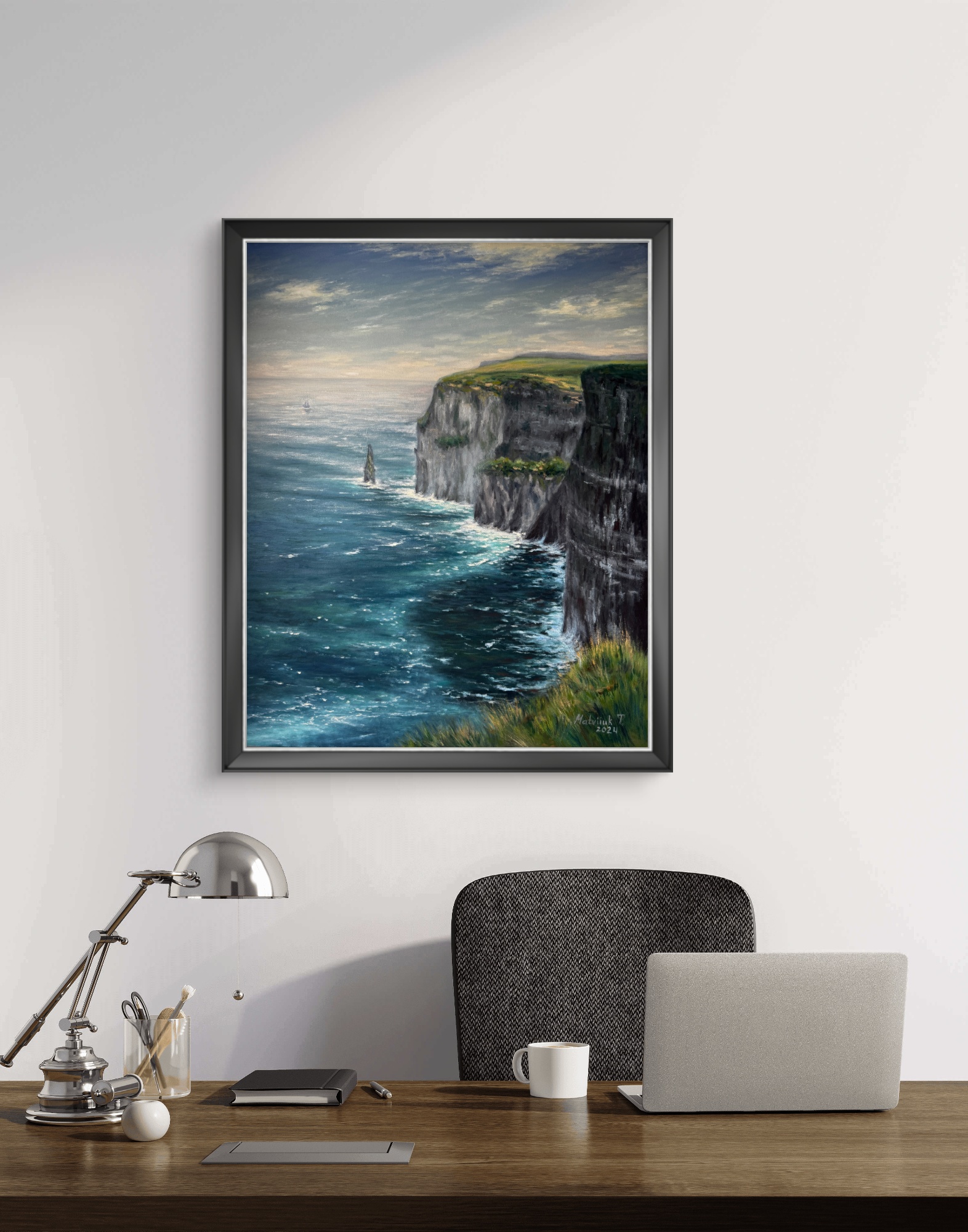 Ця картина зображує один із найвідоміших природних символів Ірландії — Скелі Мохер. Динамічний рух хвиль, глибокі бірюзові відтінки океану та світло неба створюють відчуття живої енергії Атлантики. Твір передає силу природи, її неприборкану красу та спокій, який приходить від споглядання такої масштабної панорами.