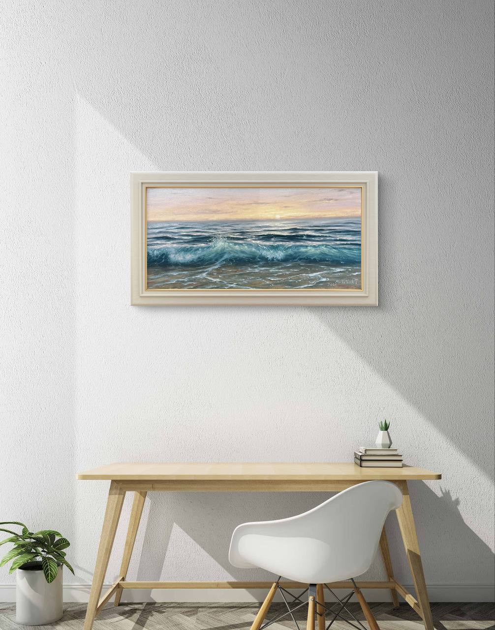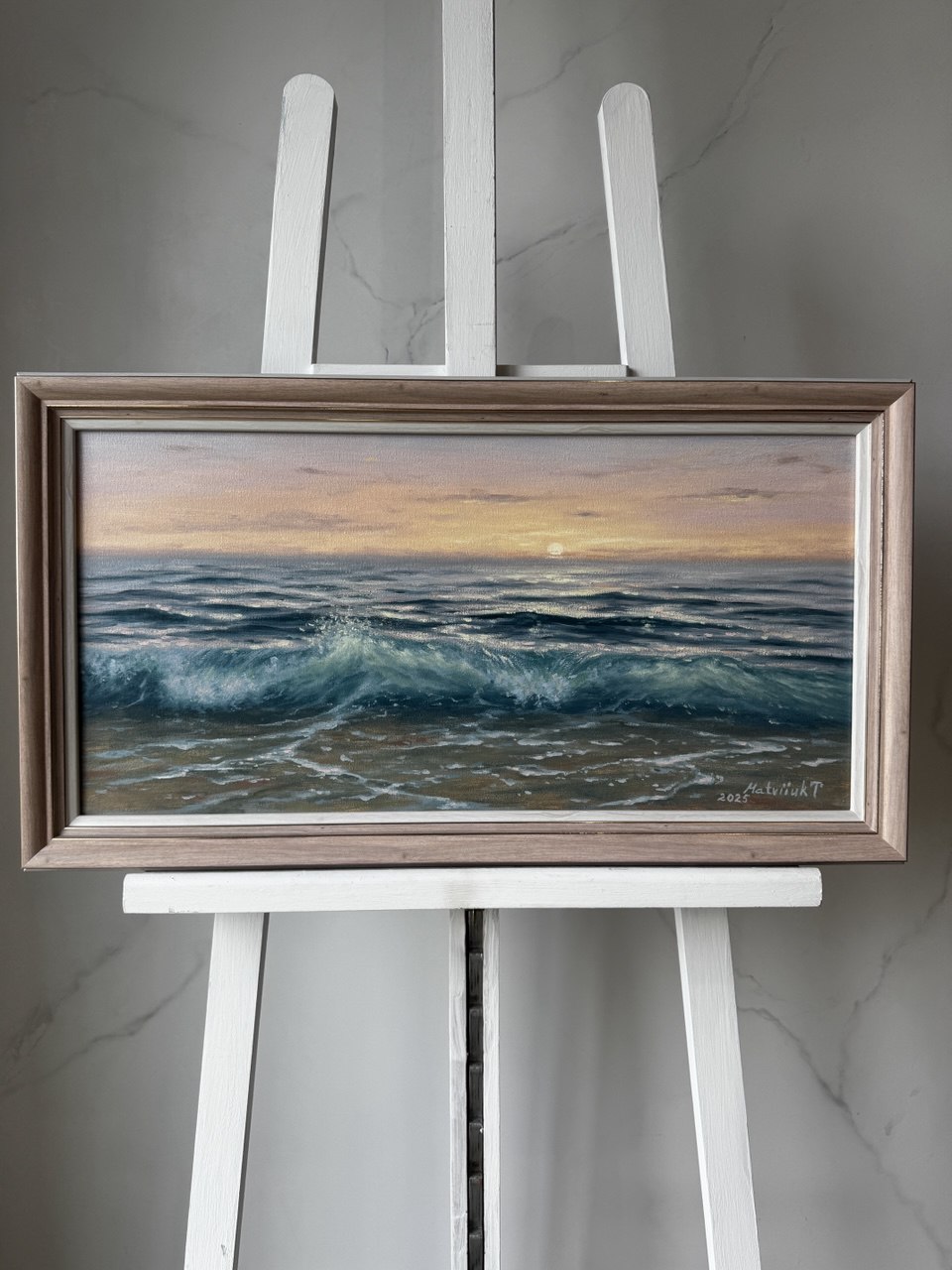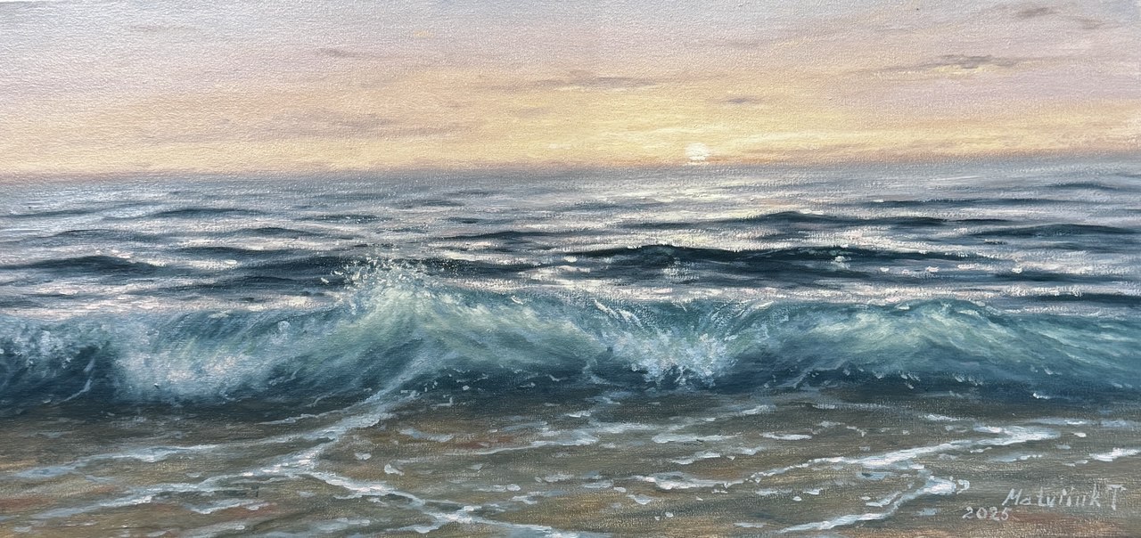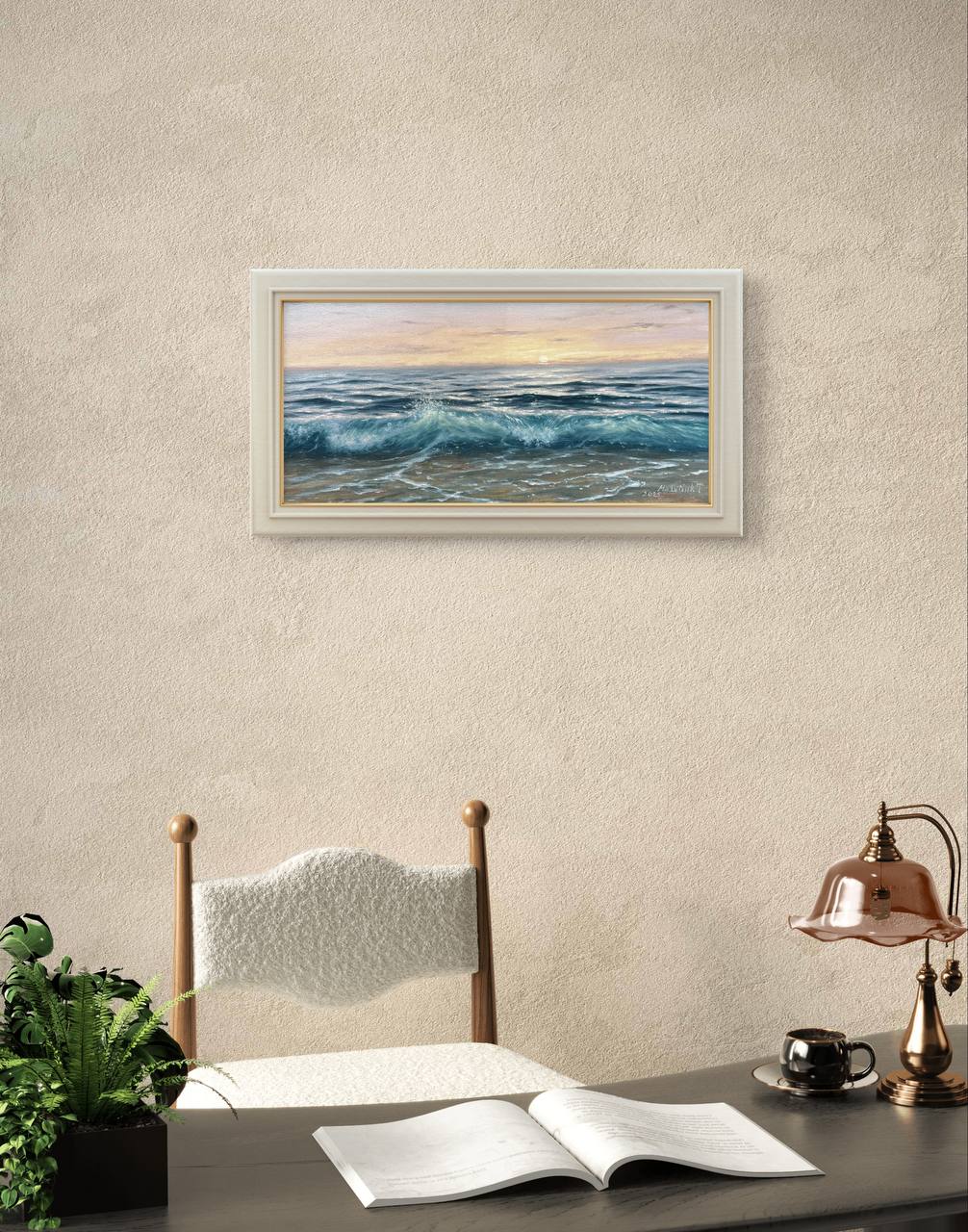«Заграва» зображує тиху красу моря на світанку, де м’яке золотисте світло зустрічається з прохолодним рухом хвиль. Картина поєднує спокій та енергію, запрошуючи глядача до моменту роздумів. За допомогою тонких переходів кольорів робота передає безтурботну силу океану на світанку.