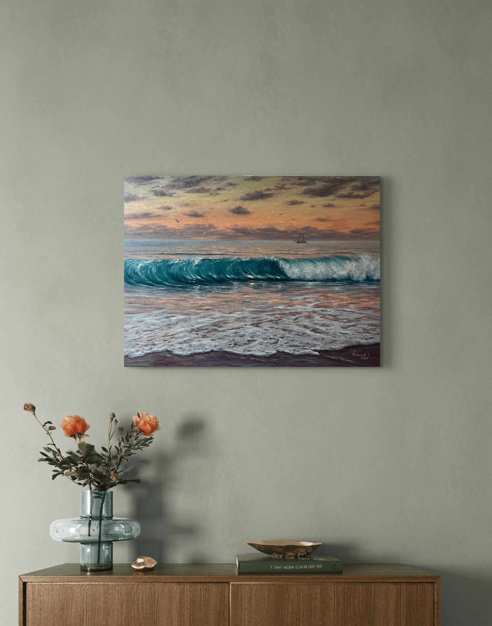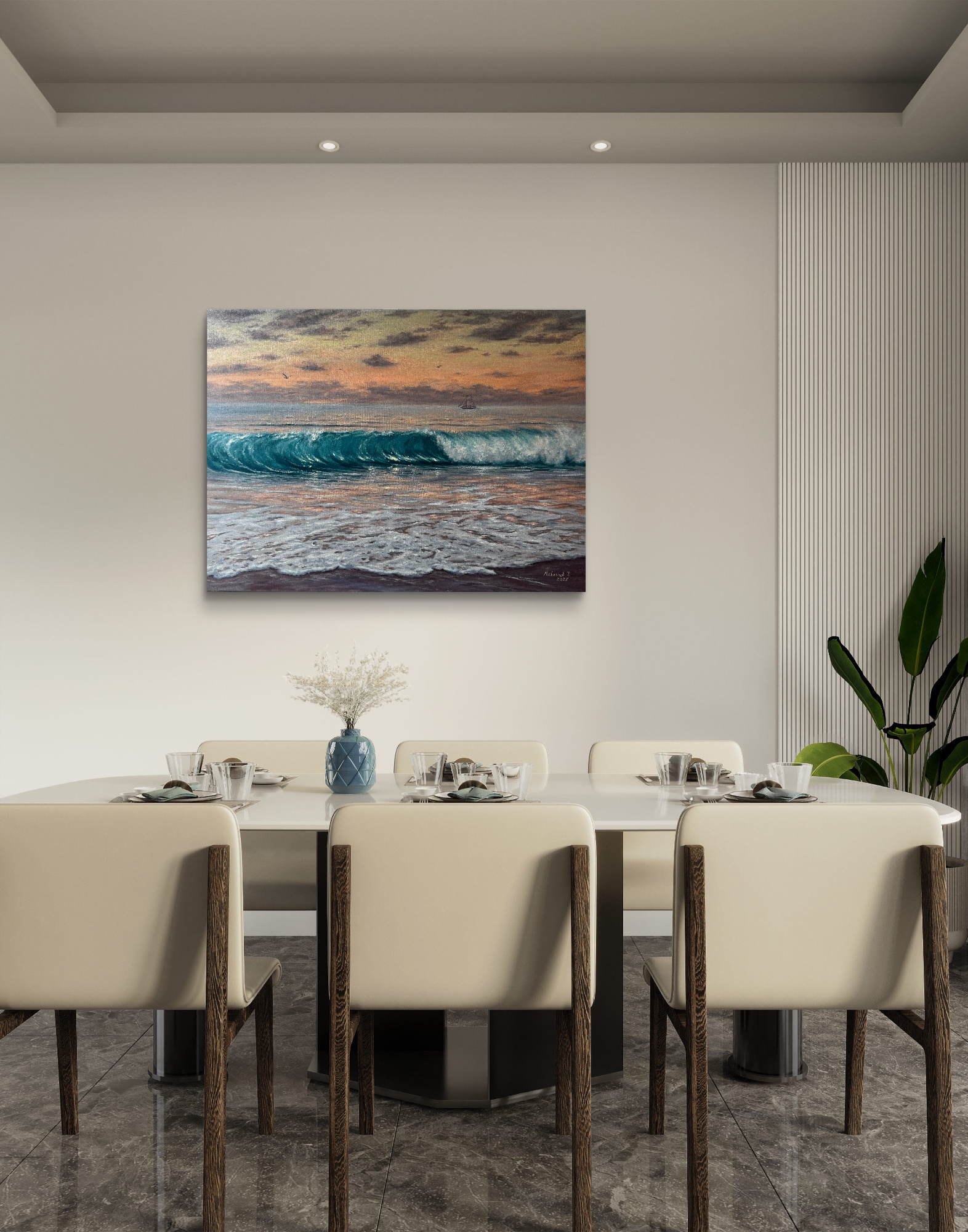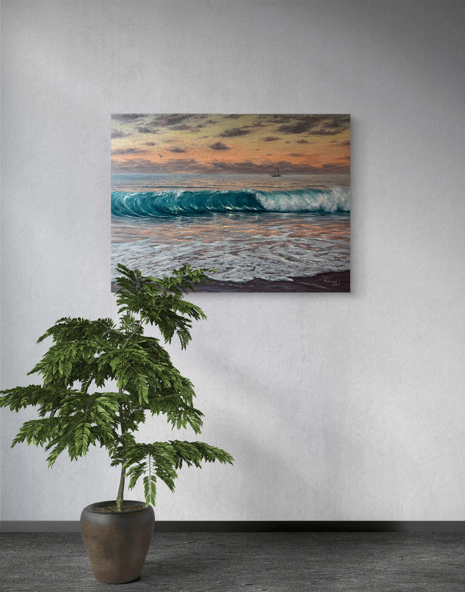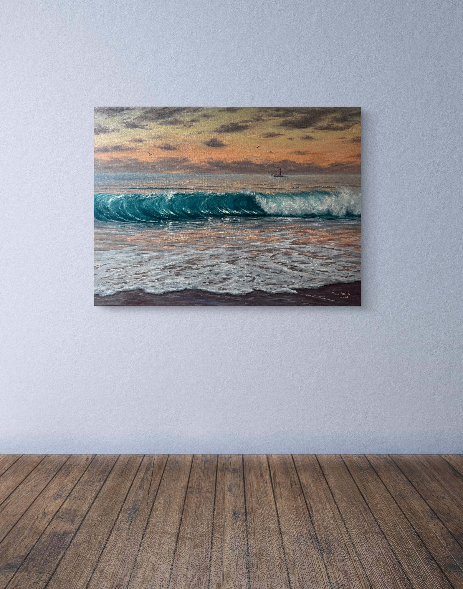 Картина гармонійно виглядає в світлих мінімалістичних інтер’єрах, додаючи їм життя, повітря та відчуття відкритого горизонту.