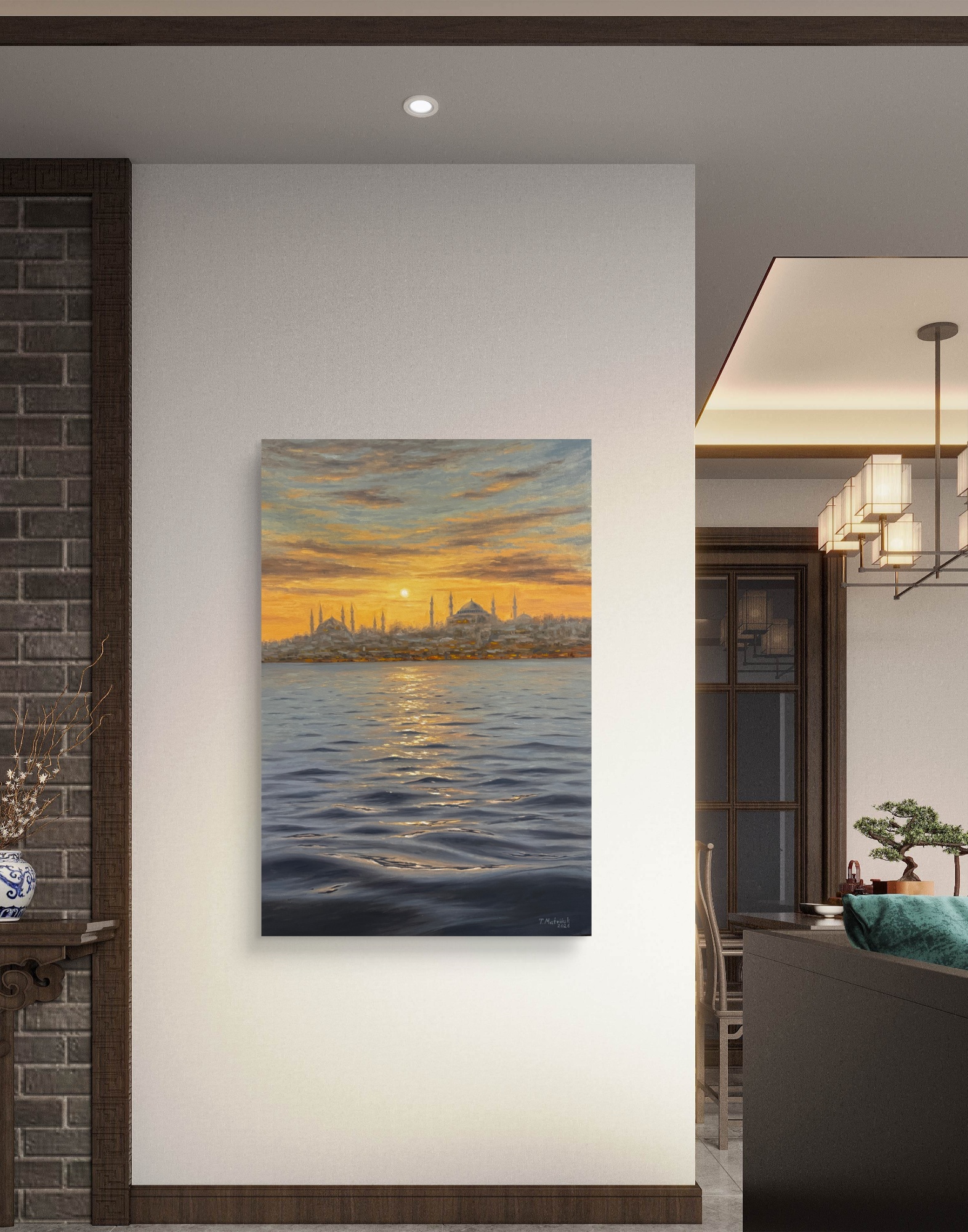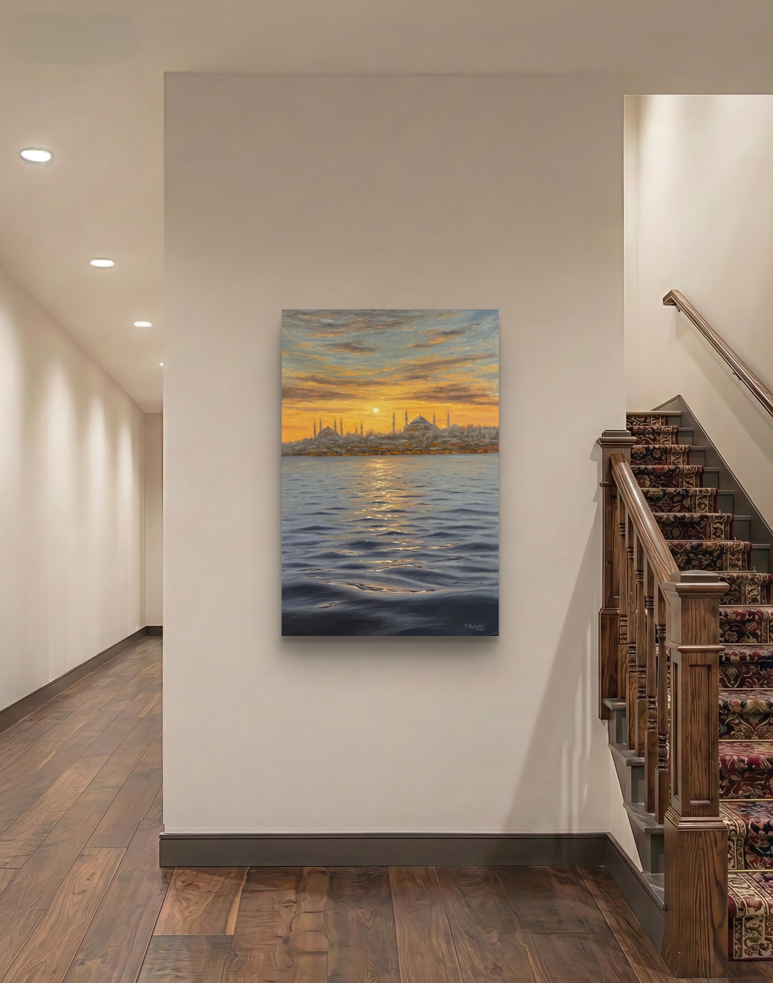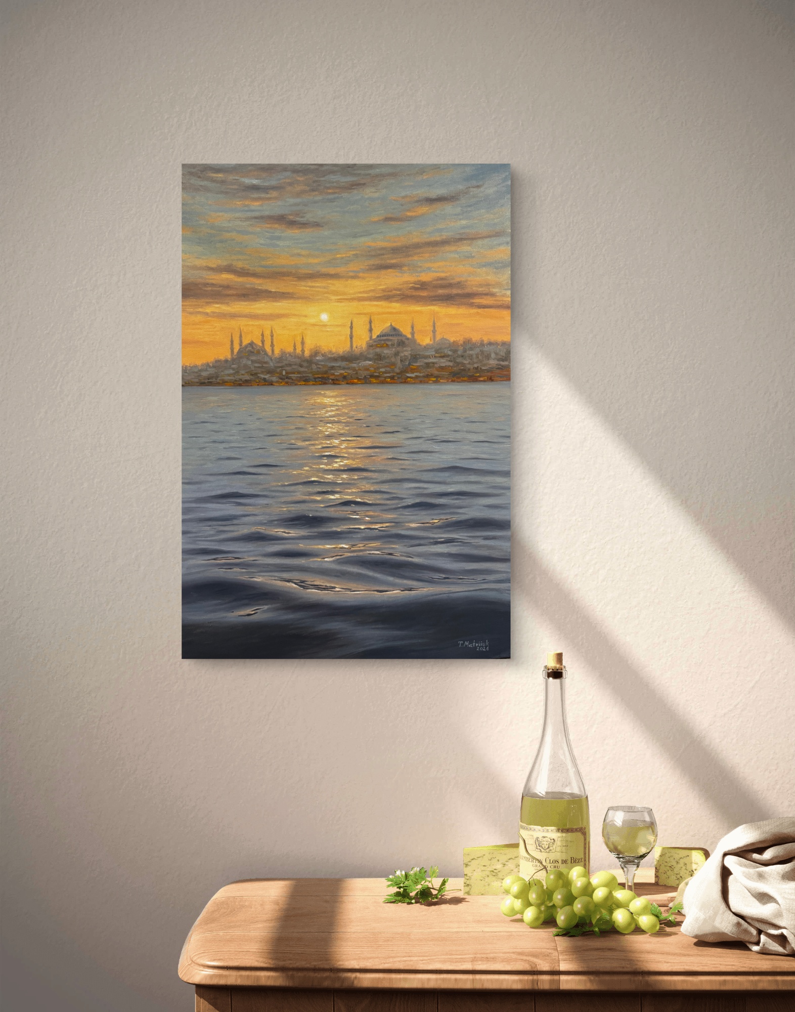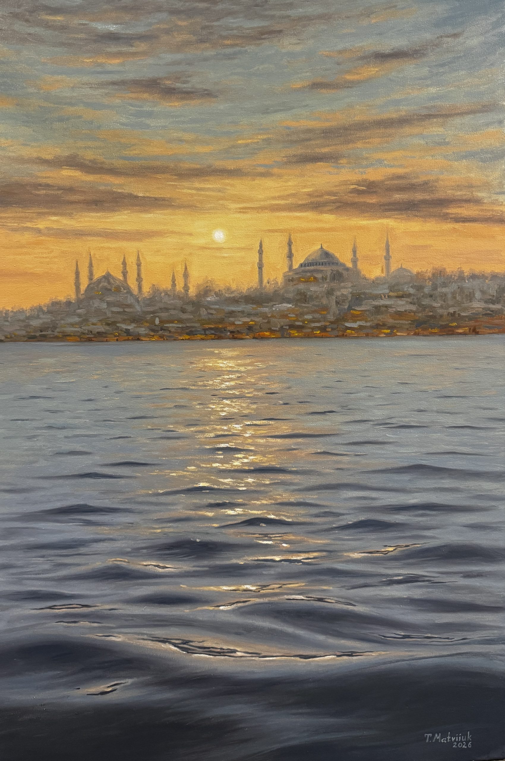 Ця картина зображує спокійний захід сонця над Стамбулом, де історичний горизонт міста м’яко вимальовується з теплого вечірнього світла. Силуети мечетей та мінаретів розчиняються в атмосфері, а відблиски сонця тягнуться по воді, створюючи тихий діалог між небом, містом та морем.
